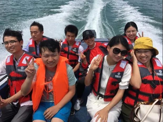 第二天早餐结束后,大家分组乘坐游艇出海,前往有“中国的马尔代夫”之称的三角洲岛游玩。游艇在海上飞驰,很快就到达小岛。这里,江天一色无纤尘,海边椰树林立,沙滩上石头奇形异状。在观景台眺望大海,使人神清气爽,心旷神怡。